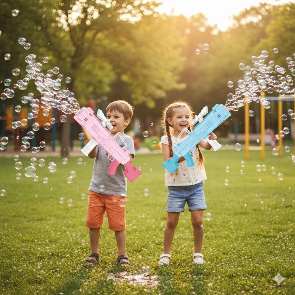 Built-in LED lights glow while bubbles fly, creating an eye-catching experience that kids love during daytime and evening play.